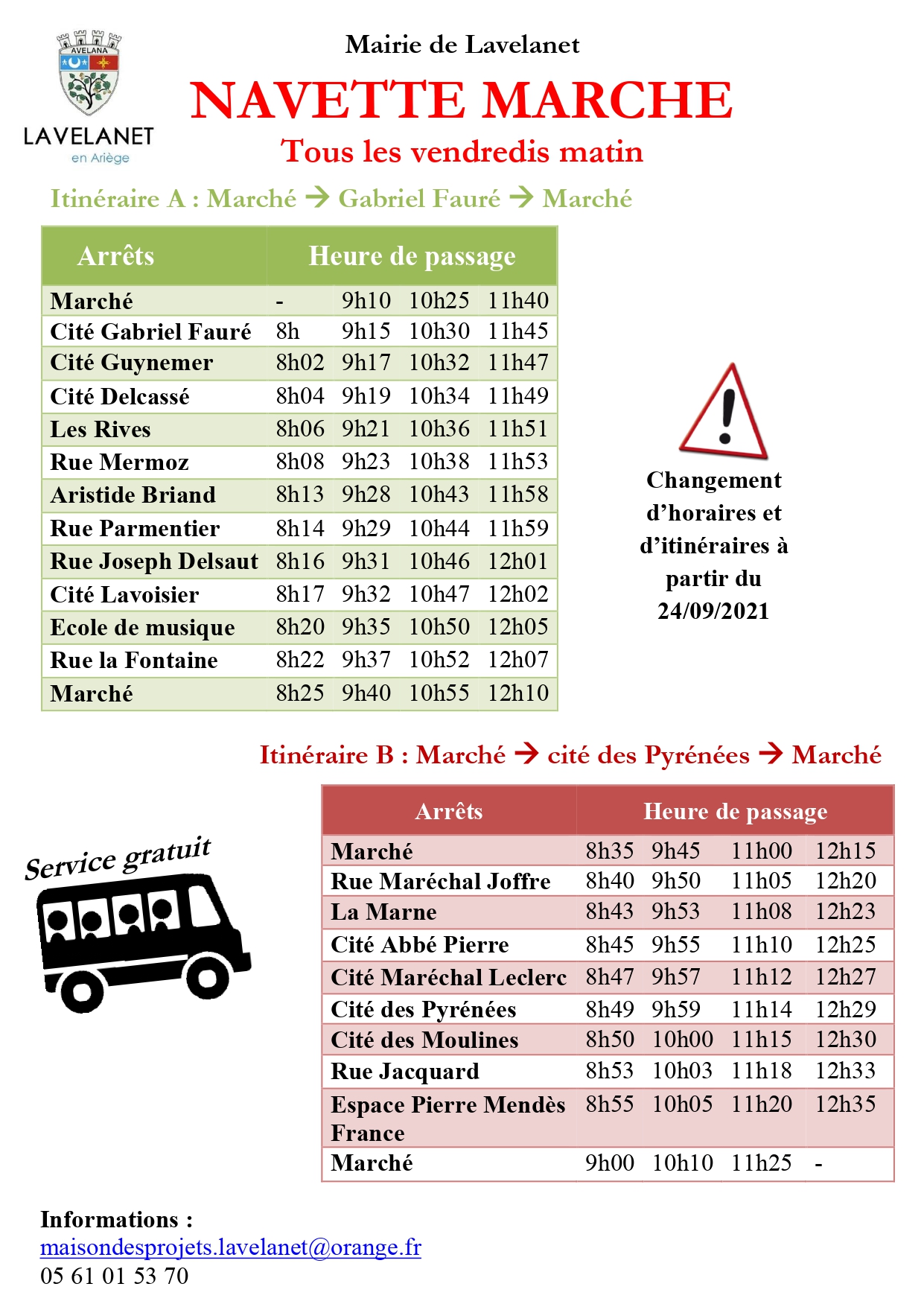 __________ A 8h15, vendredi 28 mai 2021, la navette gratuite mise en place par la municipalité de Lavelanet a transporté ses premiers usagers au marché du vendredi. Au volant du minibus, Erald Gast élu ; comme passagers, Éliane, son mari Raoul et leur amie Élisabeth. Tous trois habitent la cité Guynemer et étaient ravis de ce nouveau service. Cette expérimentation propose deux itinéraires. Itinéraire 1 : Cité G. Fauré, rue du 18 mai 1945, Cité Delcassé, rue Mermoz, Aristide Briand, avenue Alsace-Lorraine, Aldi et le marché (espace Roudière). Itinéraire 2 : Marché, rue Maréchal Joffre, La Marne, Cité Abbé Pierre, Cité des Pyrénées, parking stade Spécia, rue Jacquard, espace Pierre Mendès France, marché. Les services techniques de la ville ont mis en place à chaque arrêt un panneau où sont affichés les horaires.